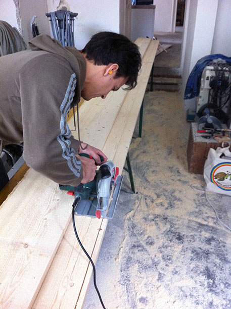 Im Baumarkt findet Ihr wahrscheinlich keine Leisten mit 5m länge. Eine einfache Möglichkeit ist es sich zwei Bretter zu besorgen. Hat man die Erste gerade Kannte geschnitten, kann man die Bretter wechselseitig als Anschlag verwenden.